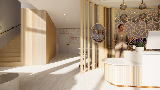 Pure: The Skin Aesthetic Clinic has been designed to act as both a physical and mental healing facility. This has been achieved by addressing 5 specific design factors. The consistent use of plants, greenery and natural materials alludes to biophilic design. A light and natural colour palette with lavender acting as a contrasting accent colour address the colour aesthetics of the space. Natural daylight has been maximised and strongly utilised throughout both the ground and first floor. Soft furnishings and sound-absorbing materials have been employed to create a peaceful and calming environment. Finally, the furniture has been custom-designed for maximum comfort and made using natural and locally sourced materials.
